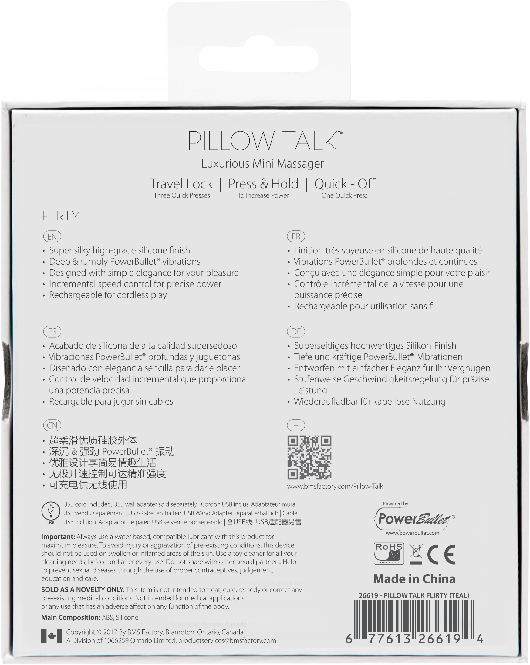 With the rechargeable battery and included USB charging cord, Pillow Talk is always ready when you are.